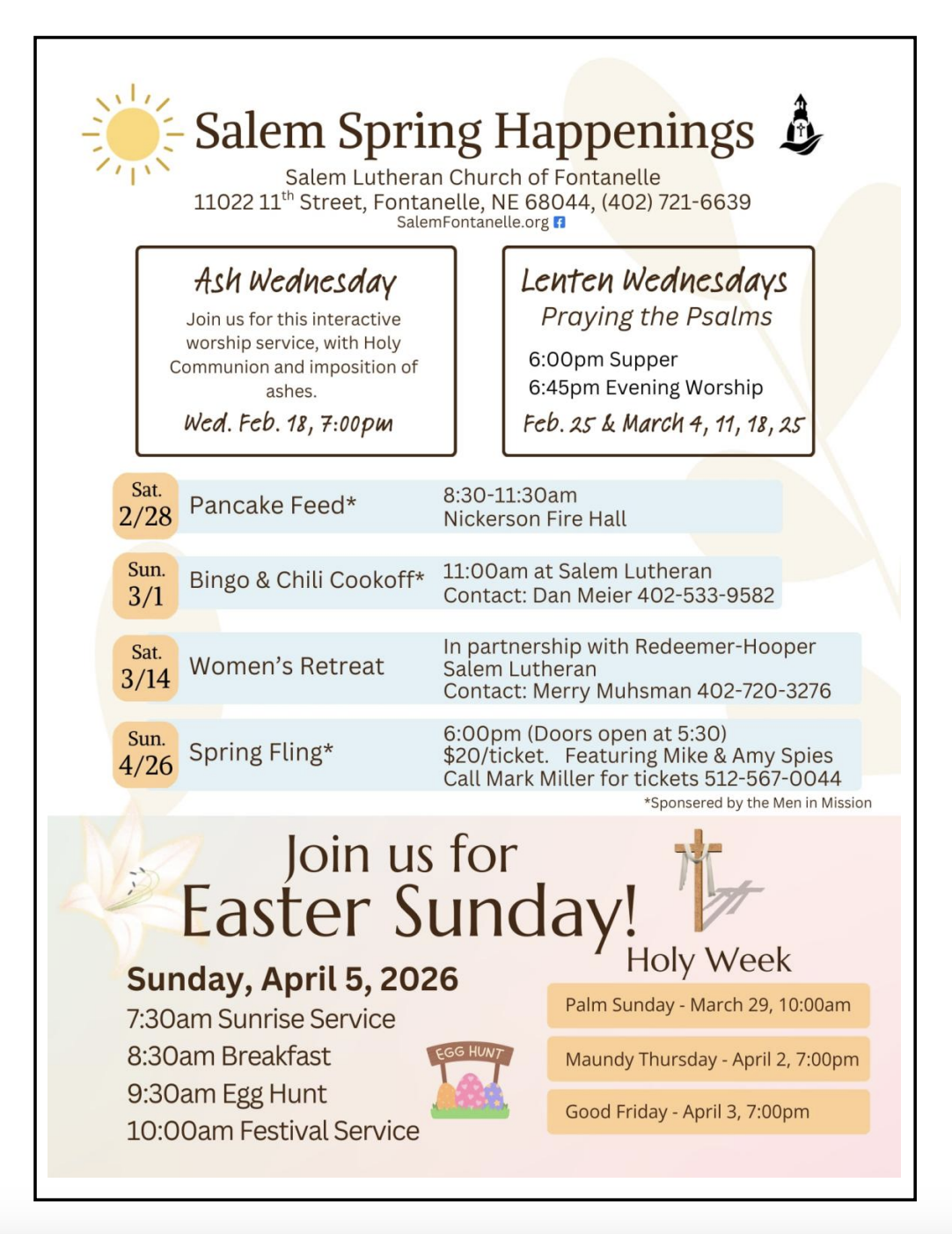 Salem Lutheran Church of Fontanelle is a congregation of the Evangelical Lutheran Church in American in the Nebraska Synod. Salem was founded in 1860 by German immigrants, and we are located out in the country in Fontanelle, Nebraska.